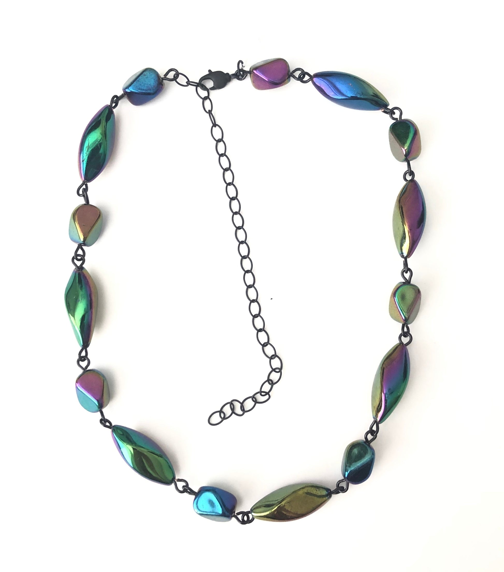 Black Iris Iridescent Beads in glowing purples, blues and greens shine in this Amelia necklace. This style is known as the Amelia necklace & features hand-linked beads, rosary-chain style and a centerpiece. Measures approximately 16" + a 6" adjustable extender.