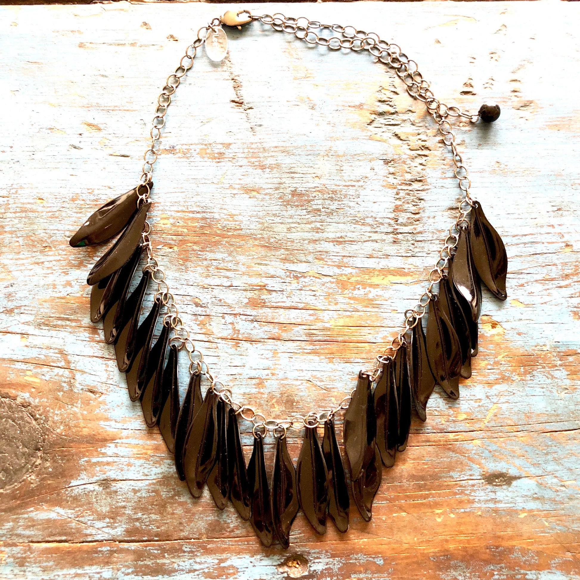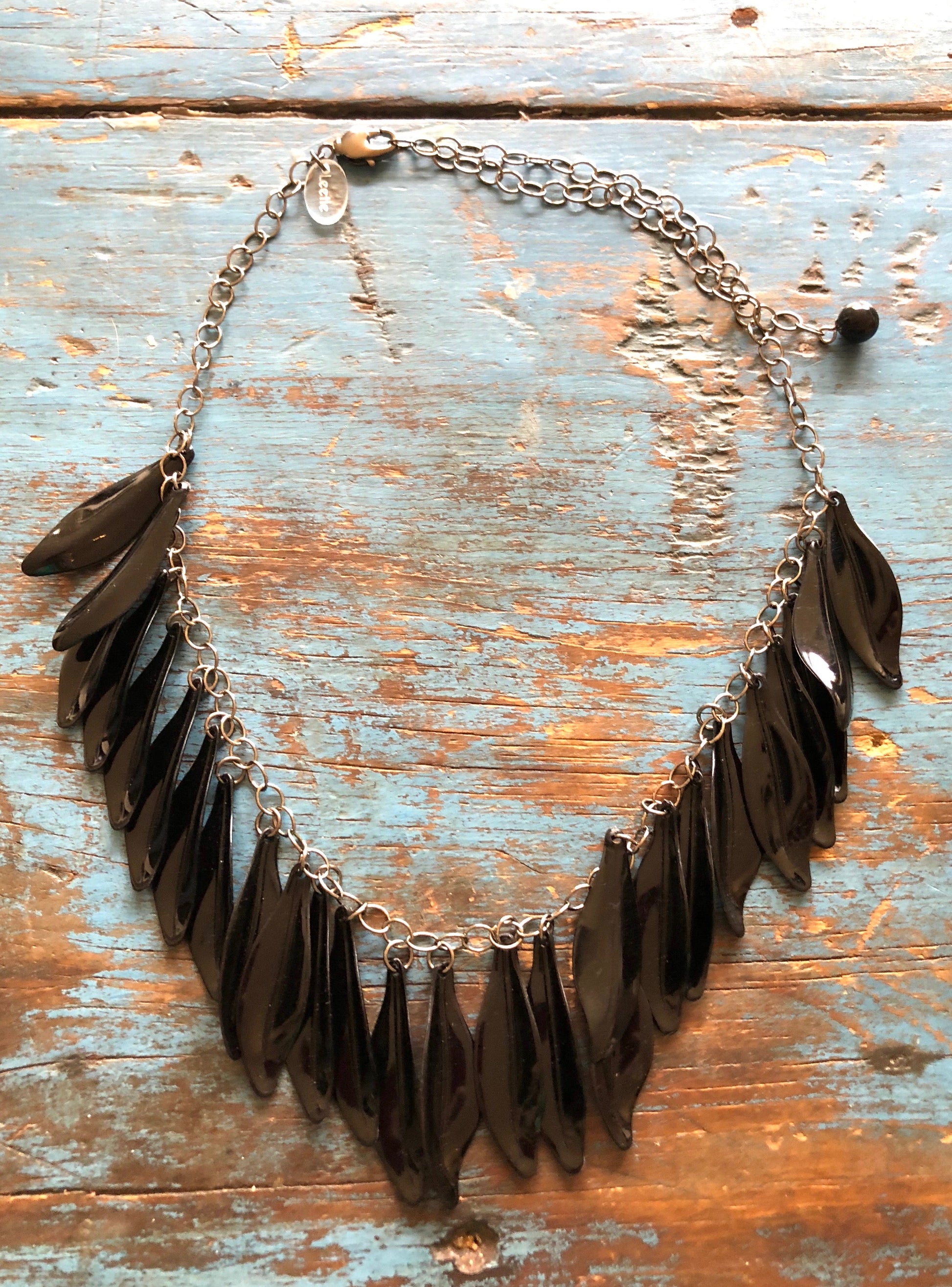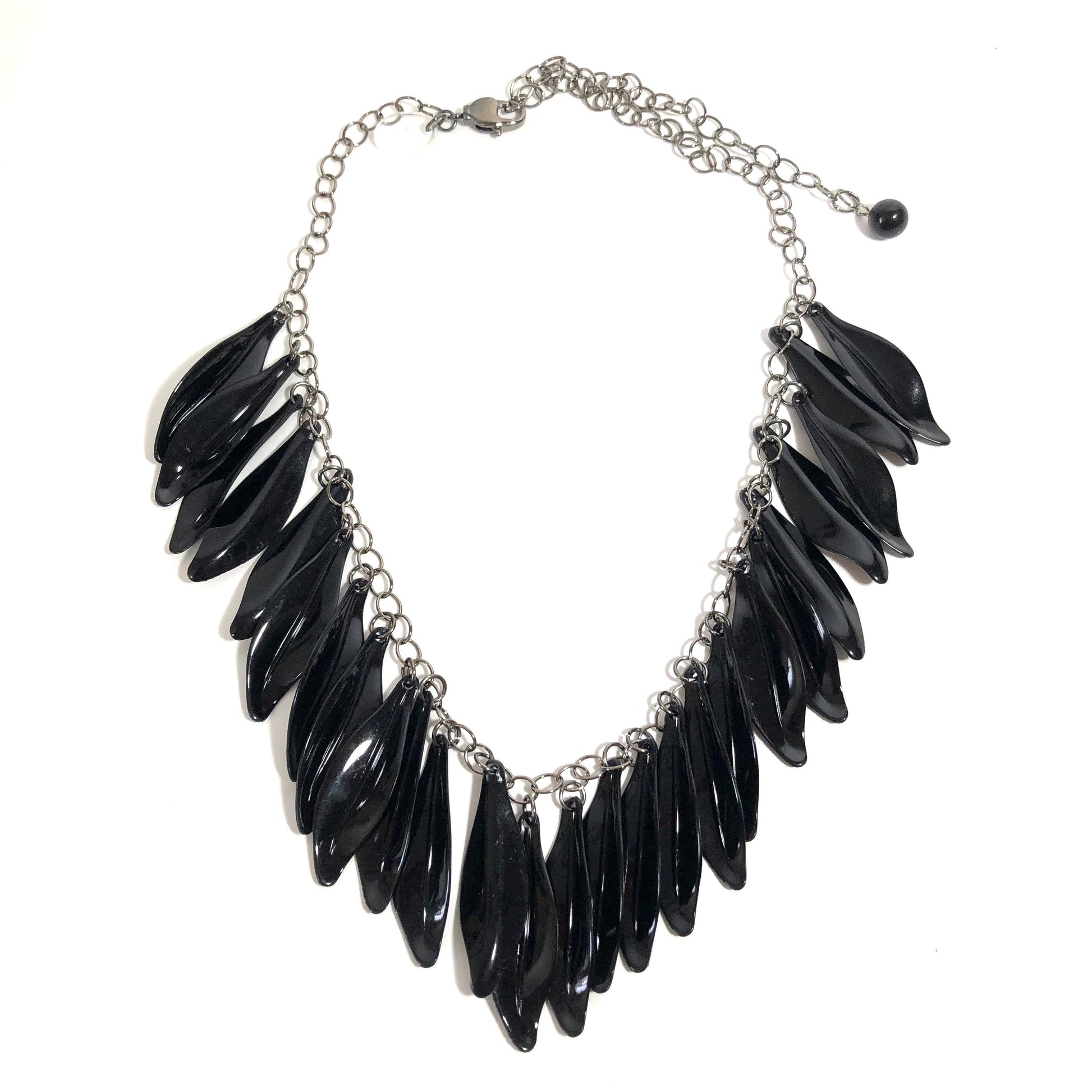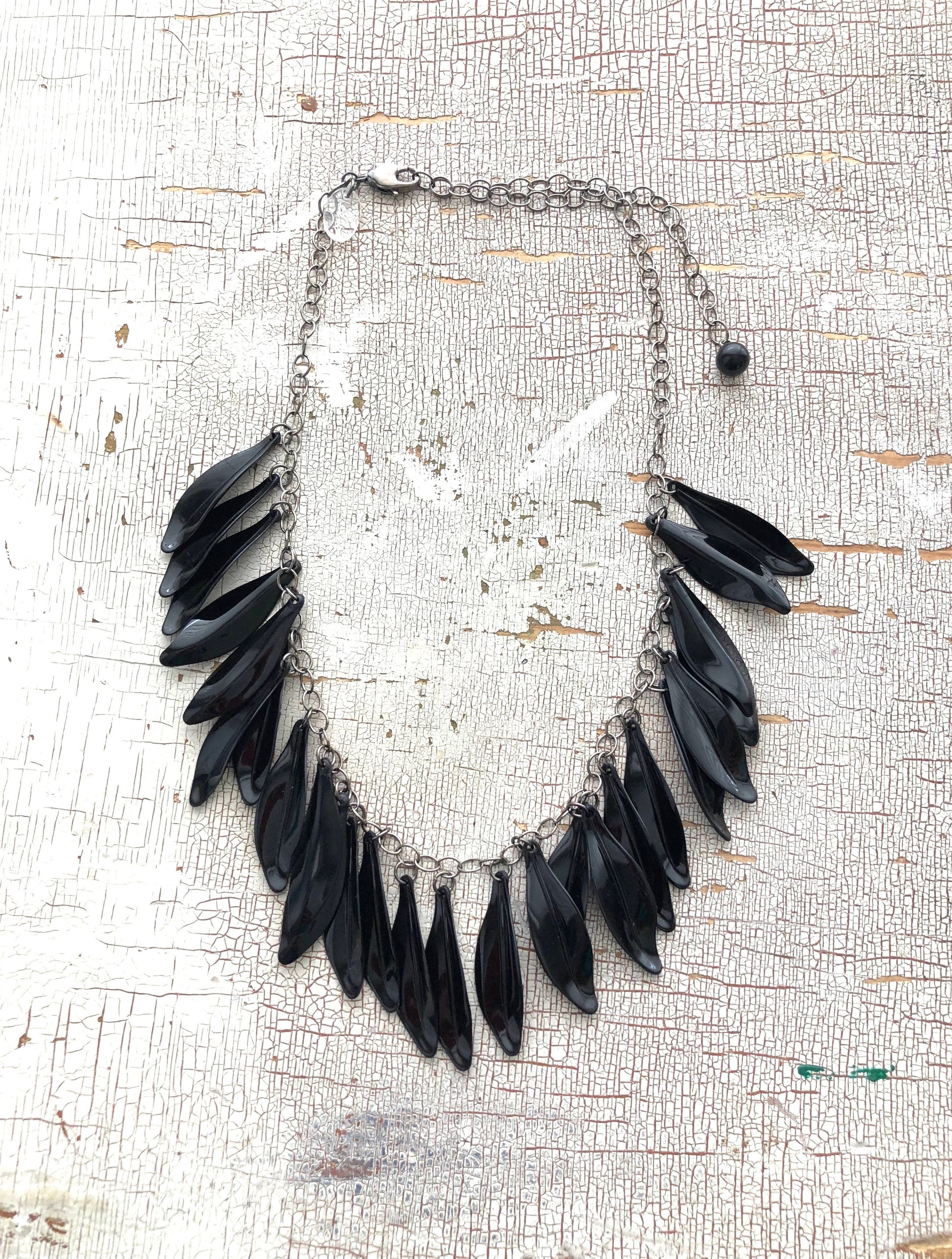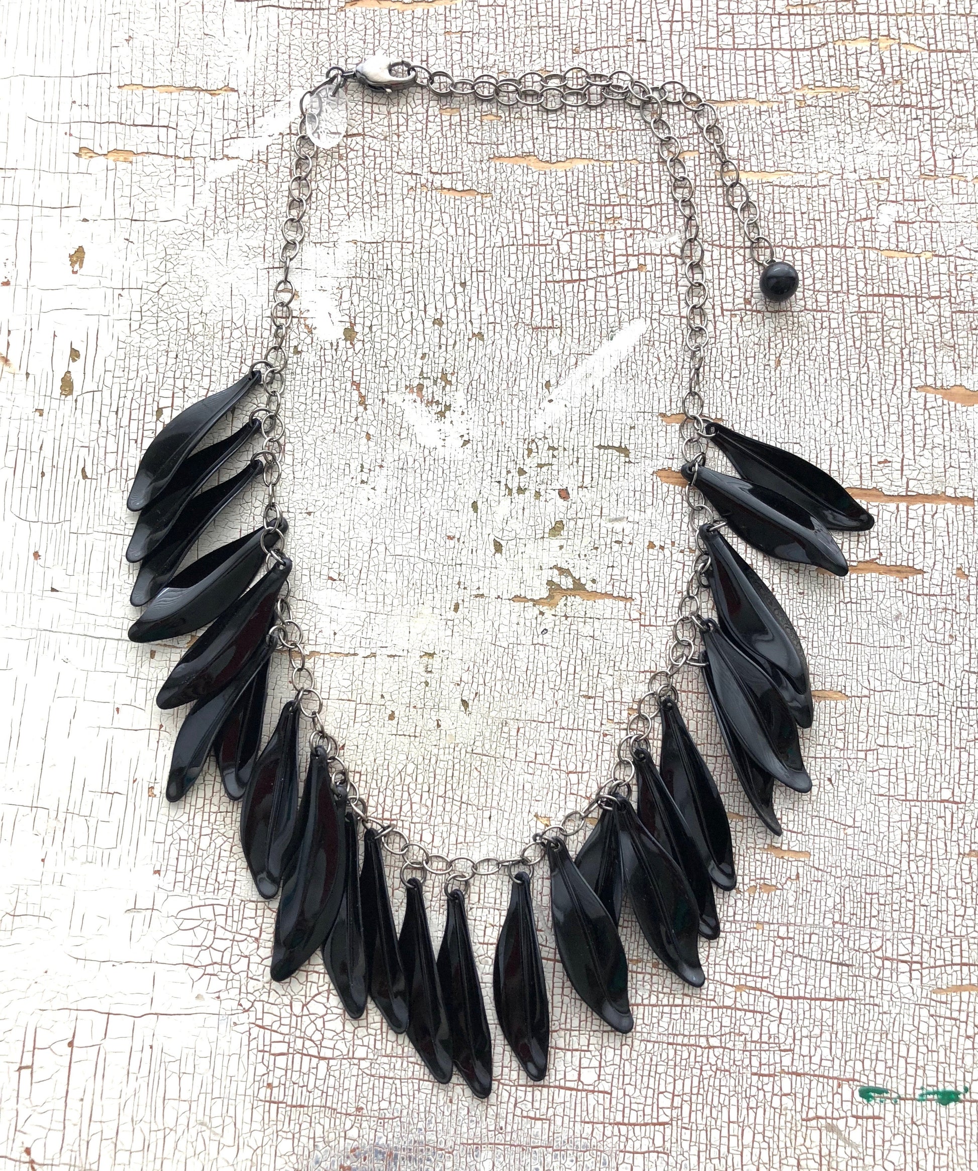 Black jingle leaves necklace made using gun metal chain & old lucite pieces. Vintage style & modern flair. Lovely bib style piece with loads of texture & fun sound & it is adjustable to varied lengths & can be worn with different necklines. Adjustable & measures 24" at longest length.