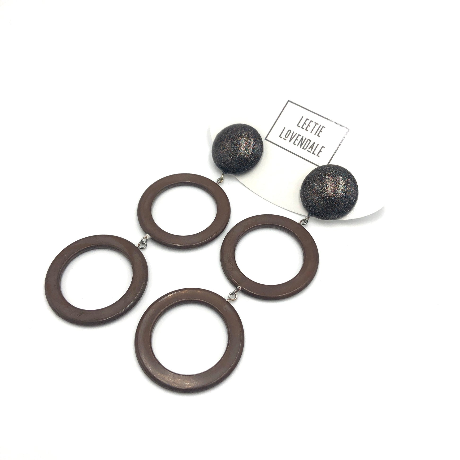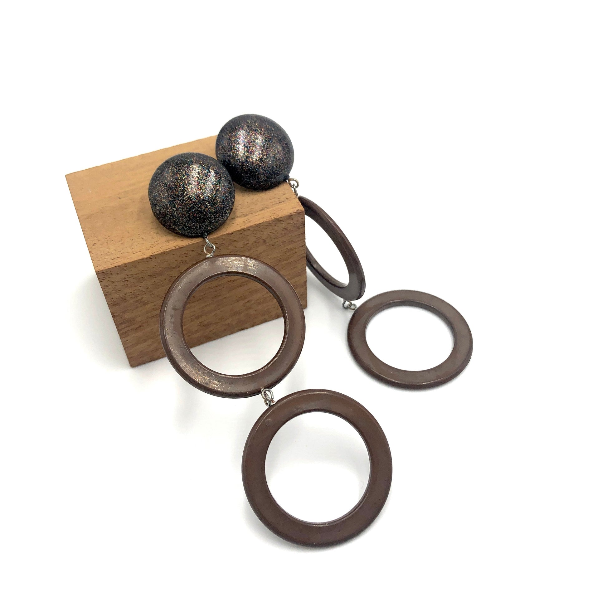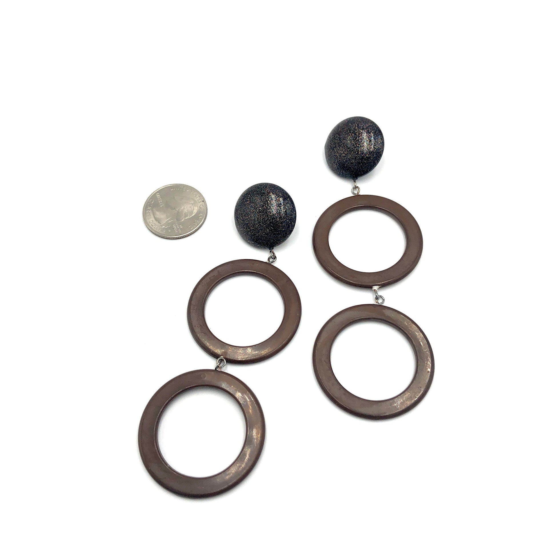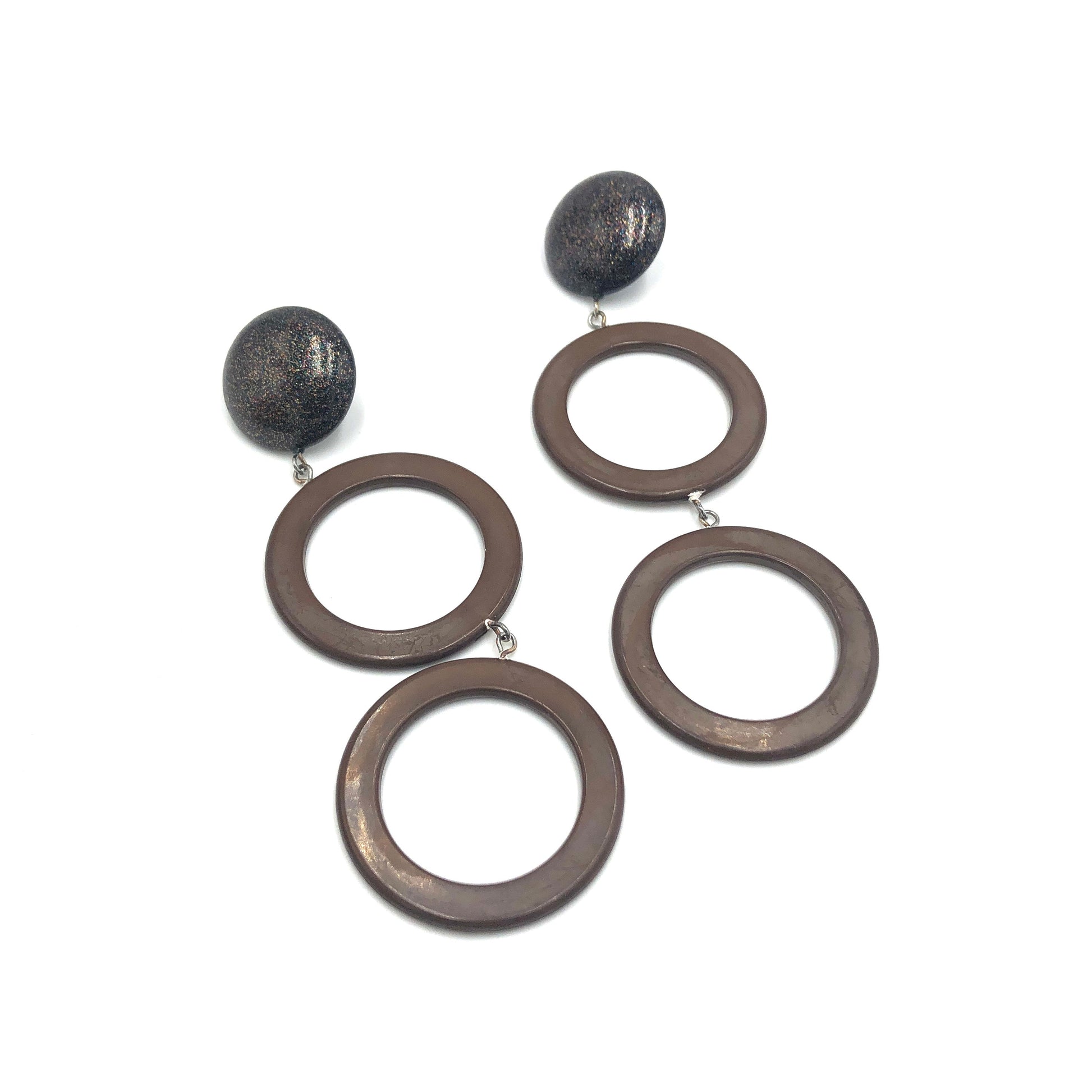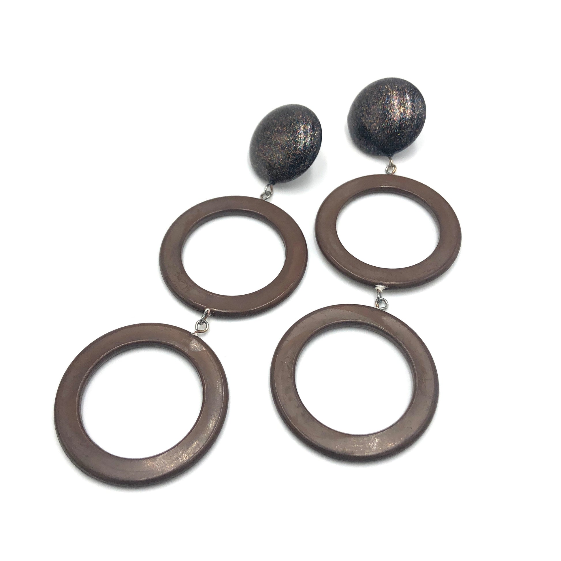 Chocolate donut drop earrings linked with black & glitter studs. Made with 60's vintage moonglow parts & make for a fluid & long statement style. Each earring is set with surgical steel posts & measures about 3.5" & about 1.25" at the widest point.