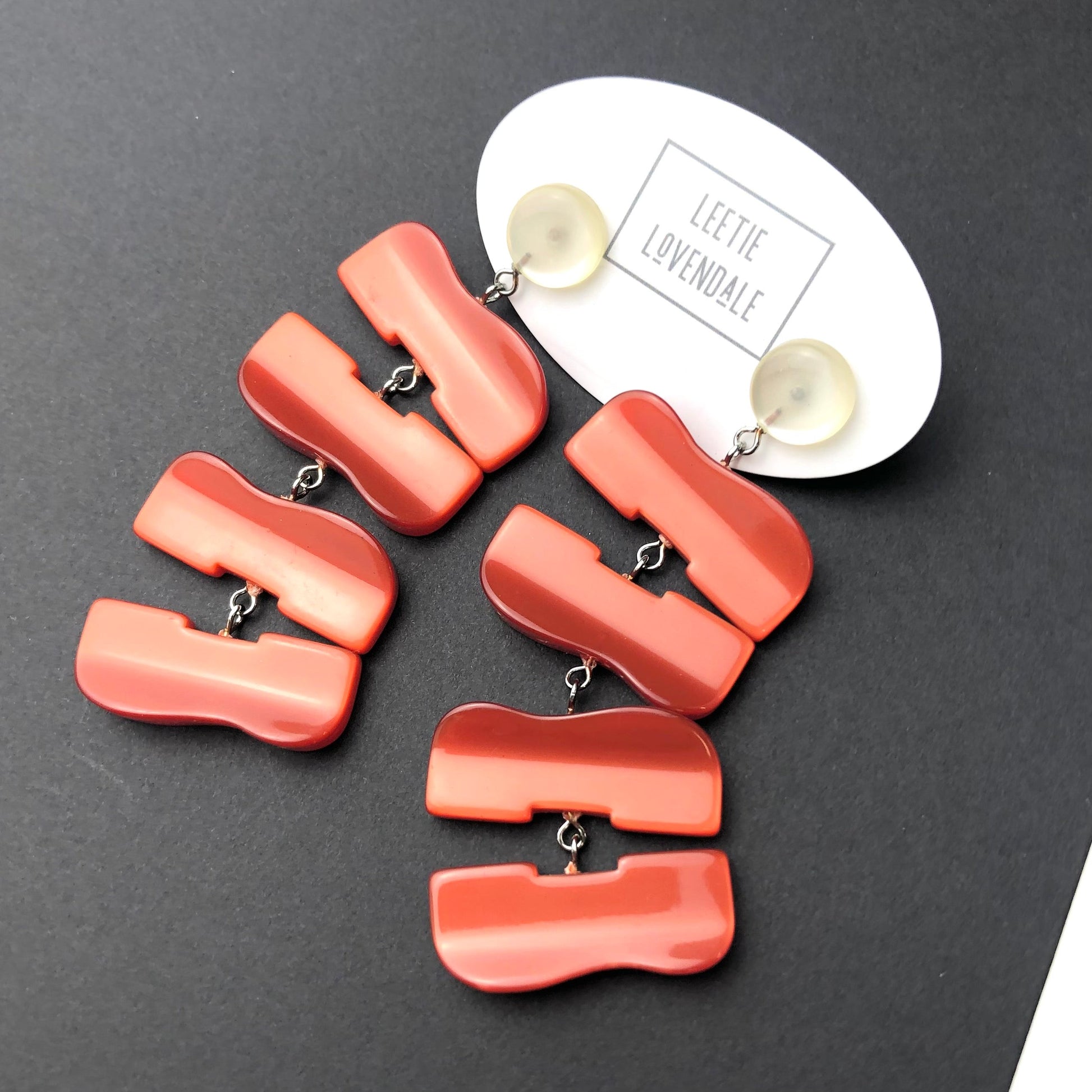 Earrings are made with mostly vintage lucite parts that were made in the US in the 1960's - early 80's. We hand-set them with surgical steel earring posts and they have sturdy surgical steel/acrylic backings on them as well.