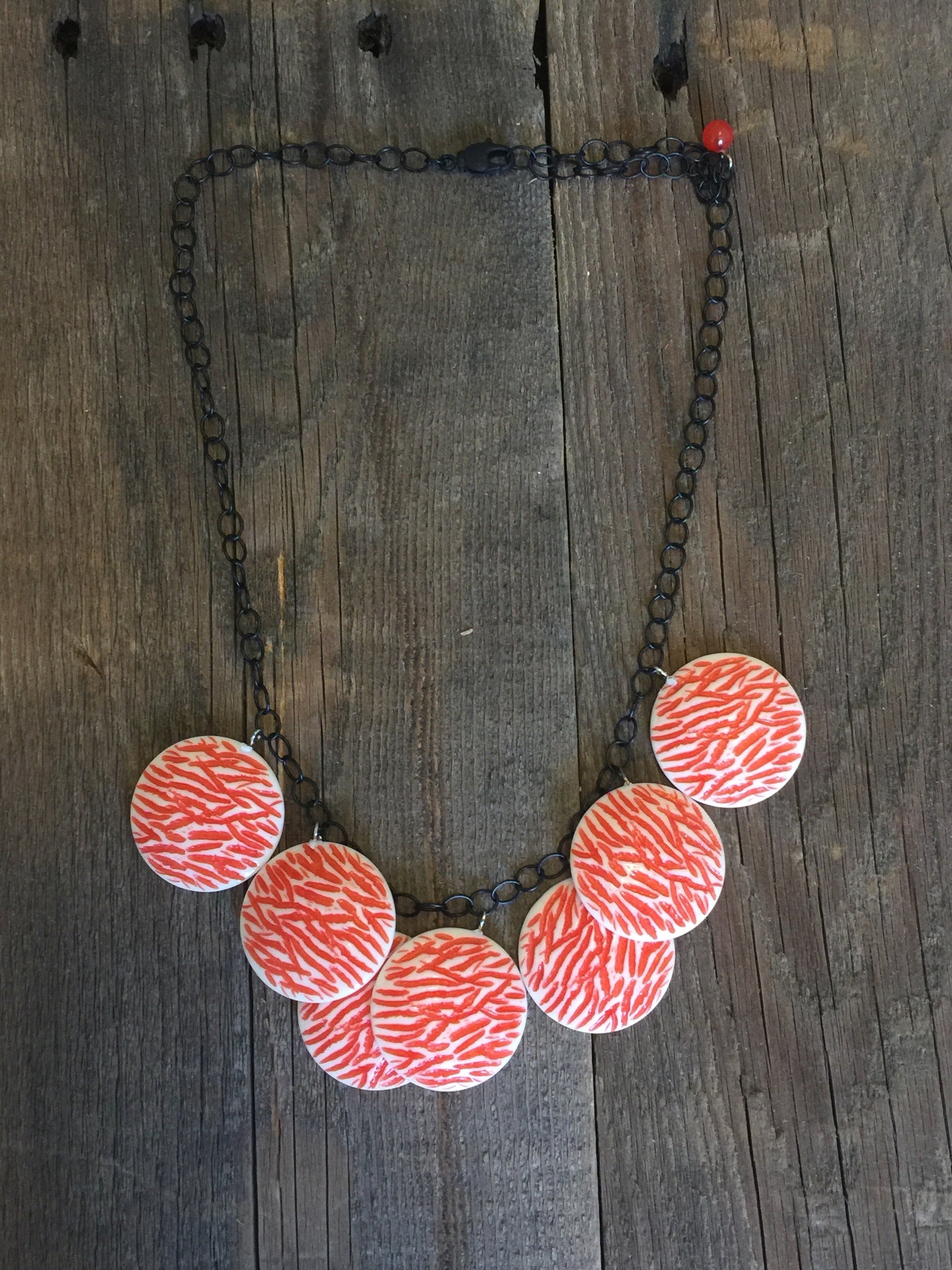 Coral and cream textured lucite charms, in a retro poker chip collar style. Each piece cascades from this gorgeous gun metal chain. Each statement necklace measures up to 24" and is adjustable. Limited availability due to vintage parts.