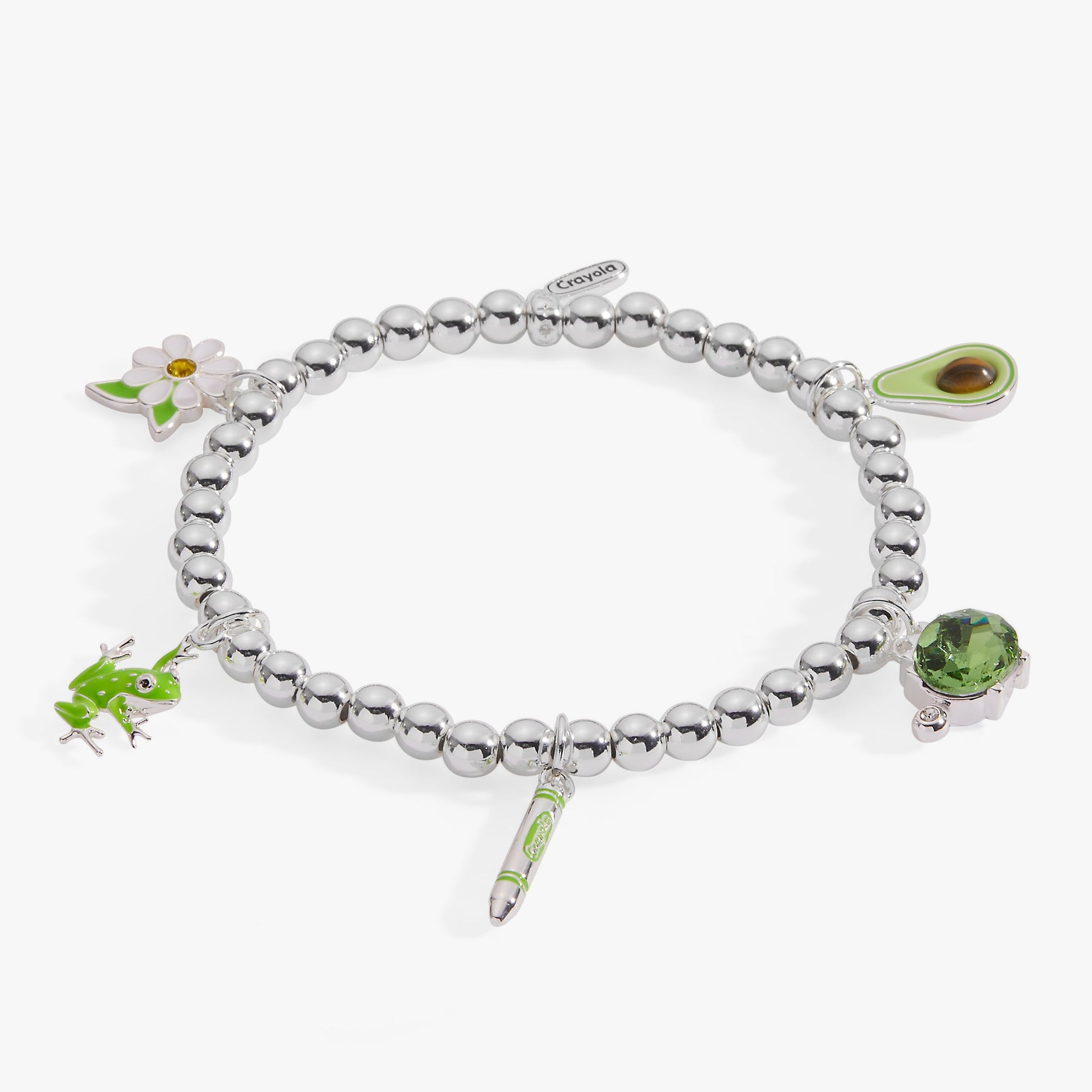 Hop into fun with this vibrant stretch bracelet featuring five whimsical charms that celebrate nature and creativity. Adorned with a cheerful green enamel frog, a colorful metal and enamel crayon, a delicate daisy accented with a sparkling citrine stone, a peridot dinosaur, and a charming avocado with green enamel and amber stone details, this playful piece brings joy to your wrist. Perfect for Crayola fans and nature lovers alike. The comfortable stretch design makes it easy to slip on and off, while the forest green color palette ties all the charms together in perfect harmony. Each charm tells its own story—from the artist's crayon to the whimsical woodland creatures—creating a bracelet that's as fun to wear as it is to admire. Whether you're expressing your love for creative play or celebrating the beauty of the natural world, this exclusive collaboration brings a splash of color and personality to your accessory collection.