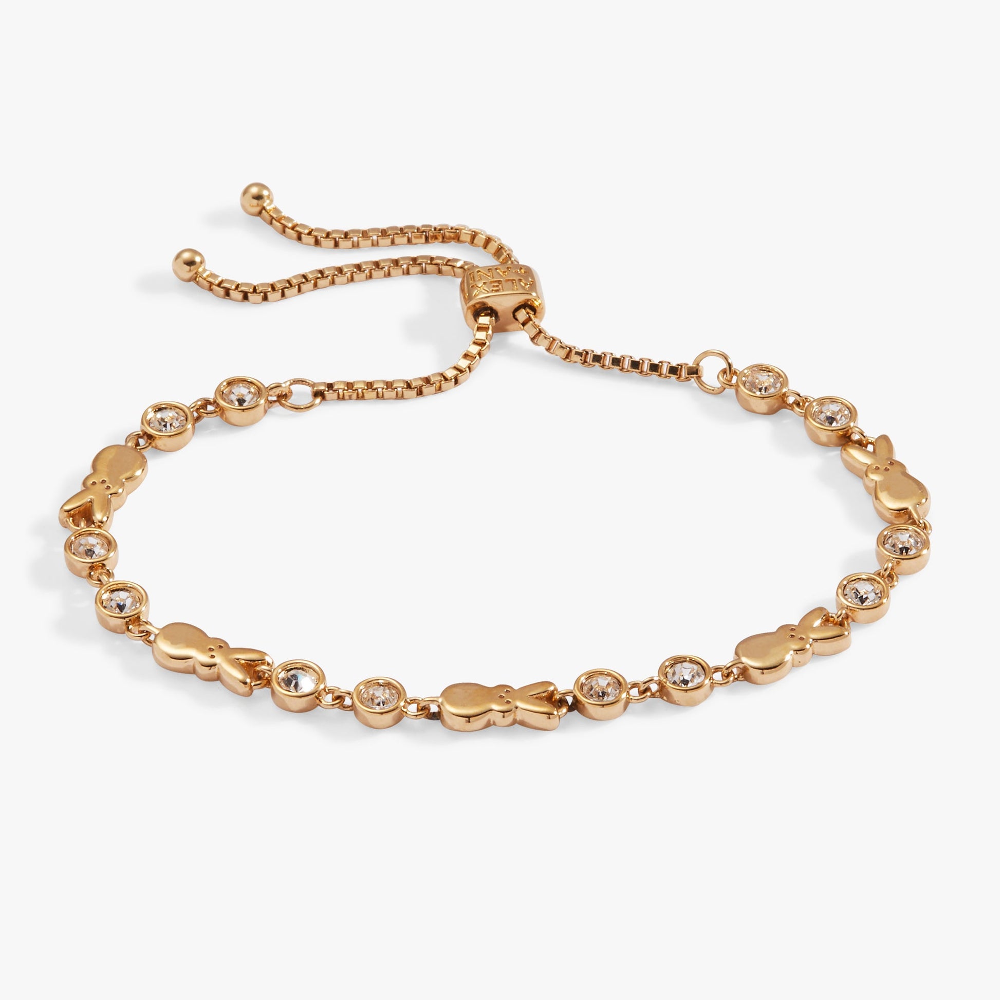 Celebrate everything sweet about springtime and Easter with this PEEPS® Bunny Bolo Bracelet, which features inline gold-tone PEEPS® bunny charms separated by sparkling crystal accents. The unique design has the adjustable length of a bolo bracelet, but also has a lobster claw clasp that makes it easy to put it on and take it off. Wear it to welcome the season — or gift it to "somebunny" you love.