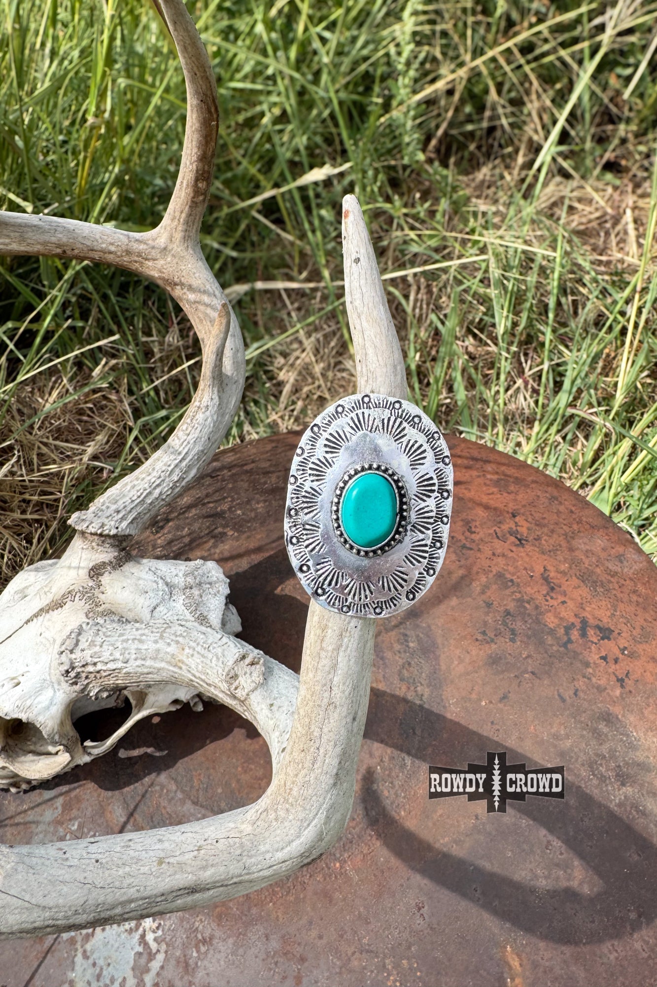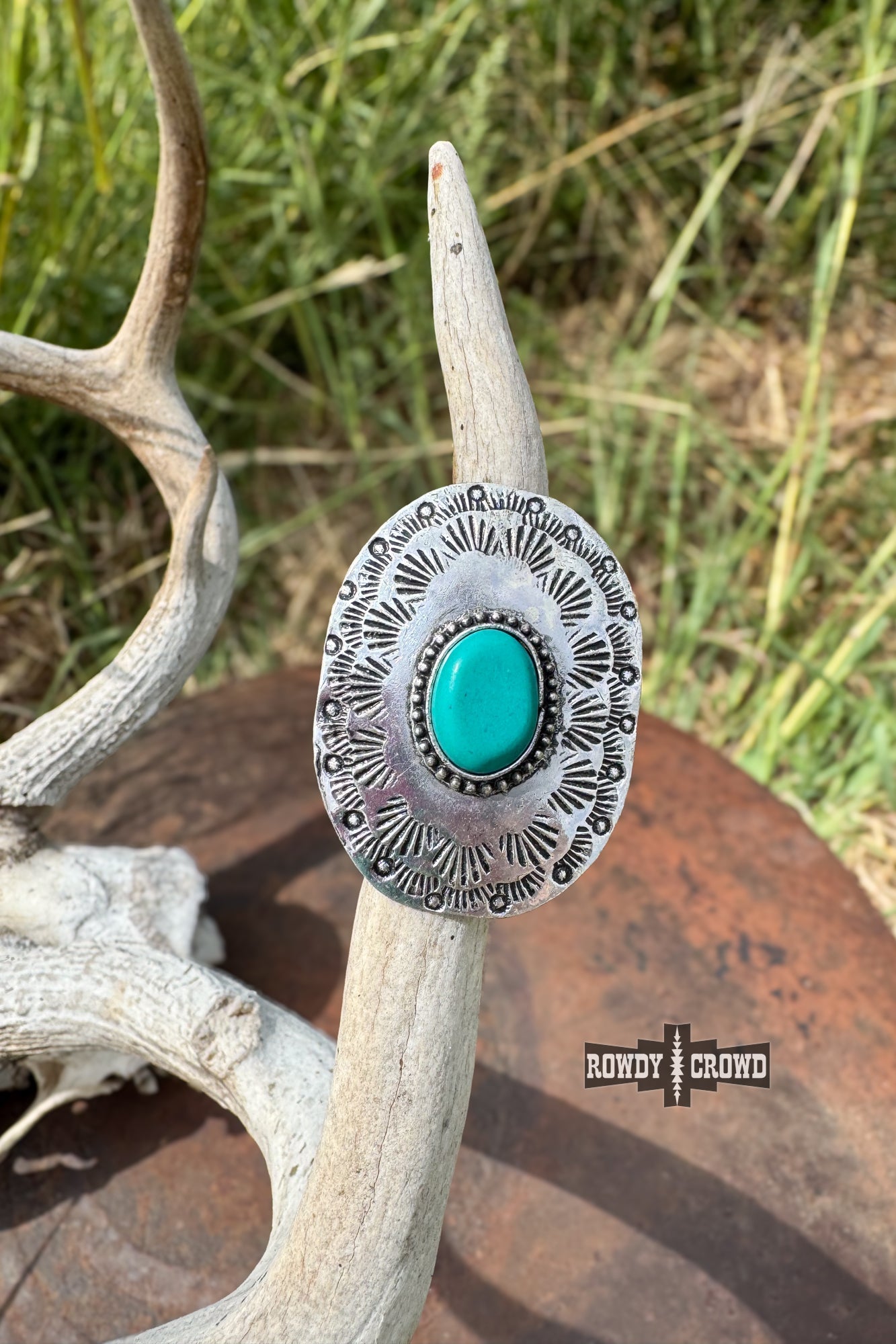 Classic and bold, the Sunny Daze Scarf Slide features a smooth turquoise stone set in richly stamped silver. Radiating with traditional Southwestern patterns, it’s a timeless piece that adds heritage style to any outfit.