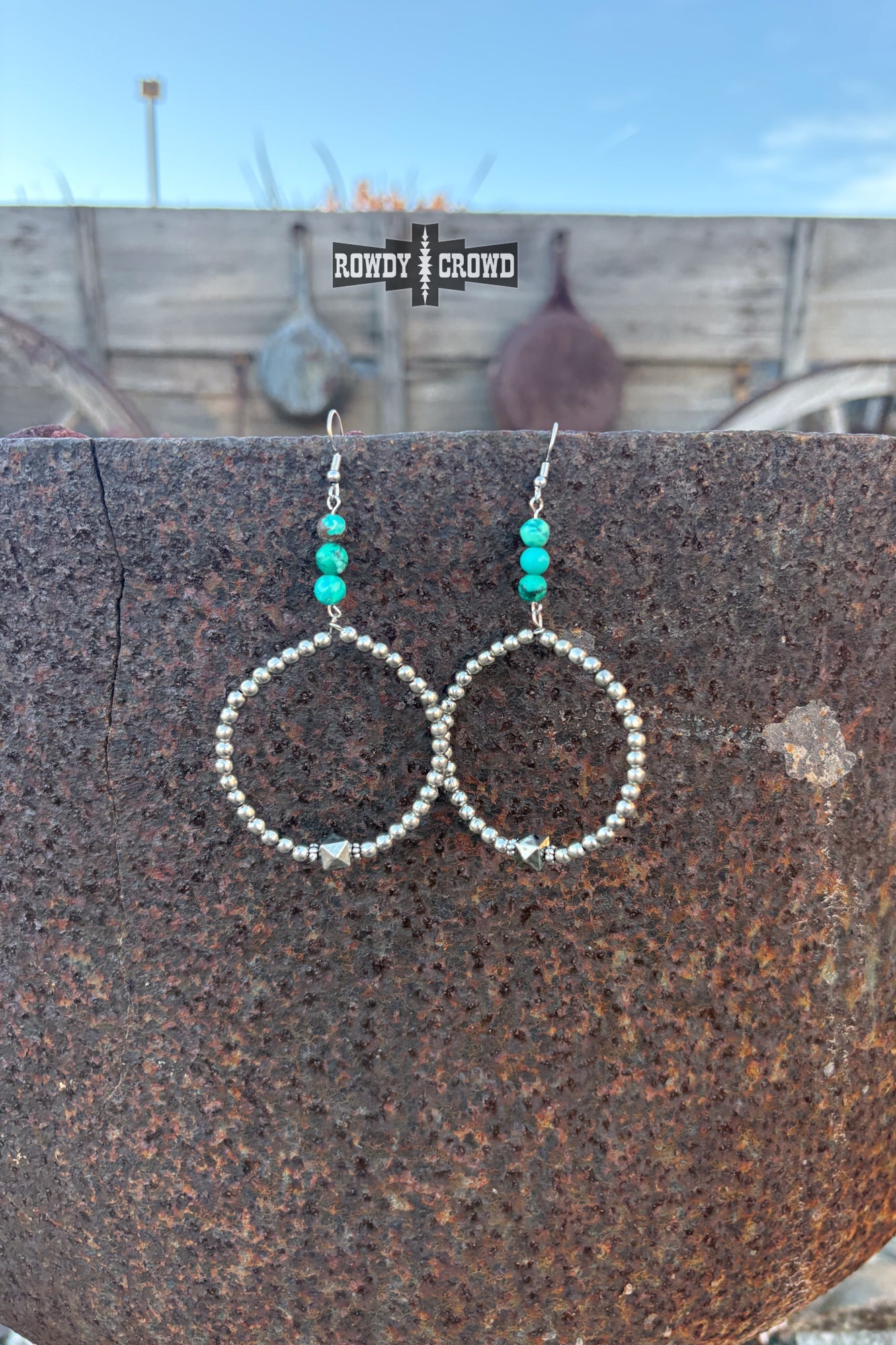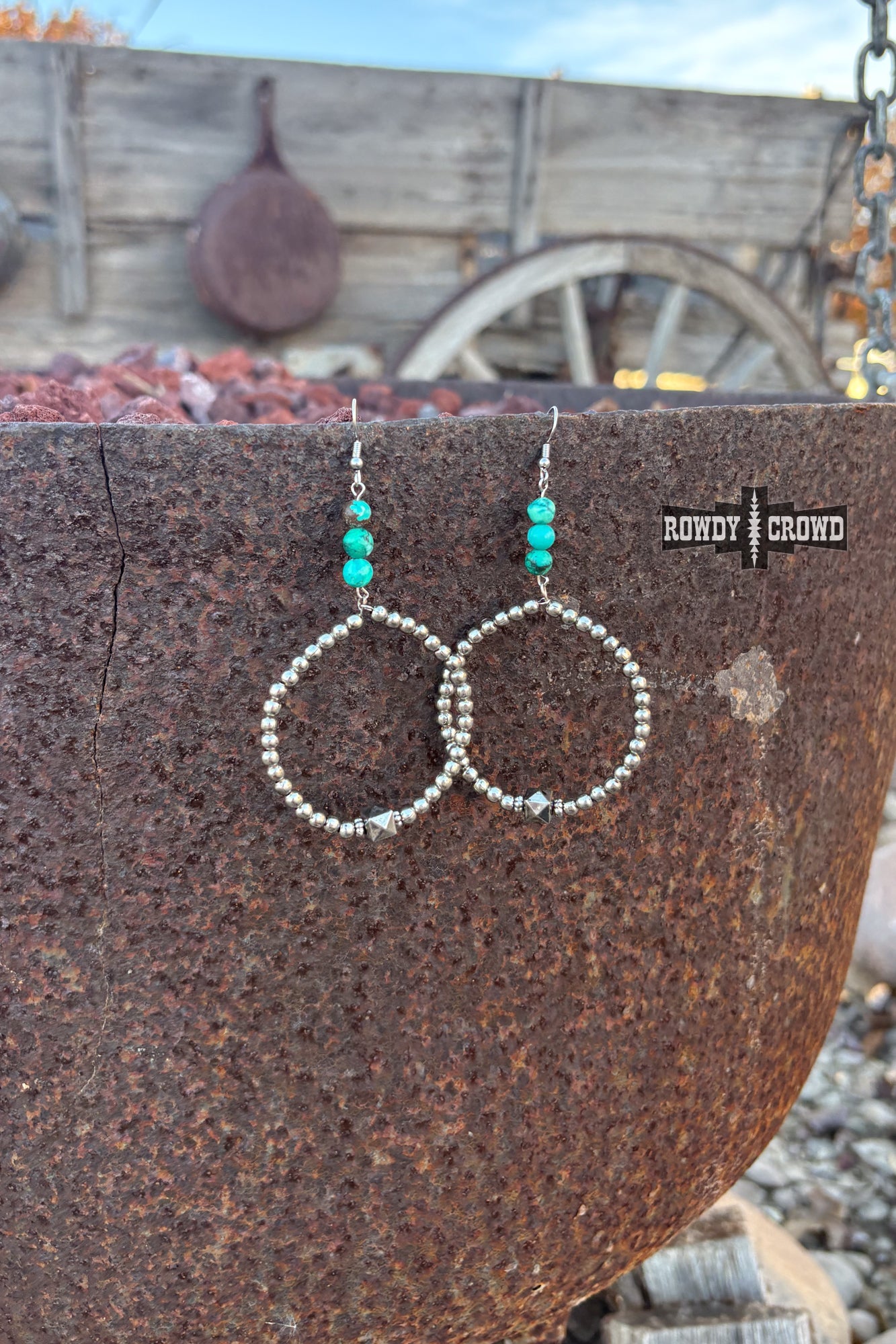 The Tatonka Hoops bring big, punchy energy with a mix of stacked turquoise beads up top and a bold silver beaded hoop below. A single faceted accent bead adds that extra edge, giving these hoops a look that’s both classic western and unmistakably rowdy. Lightweight, eye-catching, and ready to turn heads from rodeo nights to everyday wear.